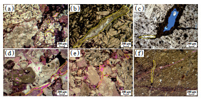 吉南凹陷石炭系火山岩岩性主要为玄武岩(图 3a,3b),孔隙发育较差,镜下偶见微孔、构造缝与粒内溶孔,绿泥石-方解石脉发育,平均孔隙度为13.1%,平均渗透率为0.190 mD。阜康凹陷石炭系火山岩岩性主要为安山岩(图 3c),镜下可见交织结构和半充填缝,平均孔隙度为2.1%,平均渗透率为0.014 mD。吉木萨尔凹陷石炭系火山岩岩性主要为火山角砾岩(图 3d,3e),镜下可见晶间孔、粒内溶孔、构造缝和粒间孔发育,平均孔隙度为12.1%,平均渗透率为1.370 mD。古城凹陷石炭系火山岩岩性主要为凝灰岩(图 3f)与安山岩,镜下观察时凝灰岩中未见孔隙,平均孔隙度为0.3%,平均渗透率0.001 mD,局部发育构造缝。