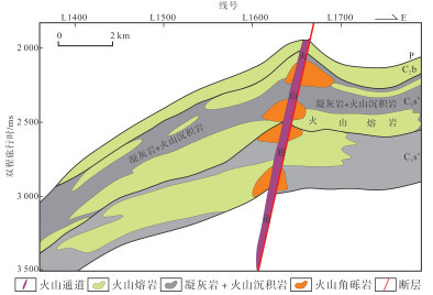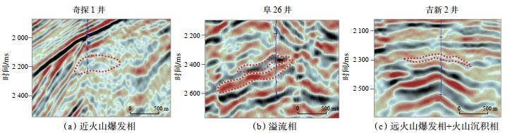 3.3.2 火山喷发模式准东地区安山岩、玄武岩和火山角砾岩呈条带状分布,说明该区火山喷发模式主要为裂隙式。如 图 9所示,“裂隙式”火山机构以断裂为依托,火山通道岩性复杂,火山活跃期由于火山活动在周缘通常发育丘状火山角砾岩,地震剖面出现杂乱反射特征,为近火山爆发相。断层西侧陡翼溢流相火山熔岩较为发育,表现为中低频、中强振幅、层状、楔形反射特征,在火山活动间歇期及低洼地带发育火山沉积相和远火山爆发相,表现为中高频、中弱振幅、层状、近平行反射特征明显。