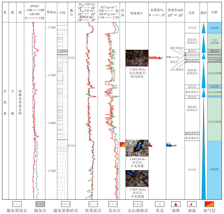综上所述,受古地貌、风化剥蚀强度等因素控制,研究区平面上不同区域石炭系的残留程度不同,凸起及斜坡区的巴塔玛依内山组、石浅滩组遭受剥蚀严重,主要残留松喀尔苏组,而在凹陷主体区石炭系发育较齐全,纵向上表现为三分结构,具有“两高夹一低”的电阻率特征,即下部松喀尔苏组a段为相对高阻,中部松喀尔苏组b段为相对低阻,上部巴塔玛依内山组为相对高阻特征(图 1b)。