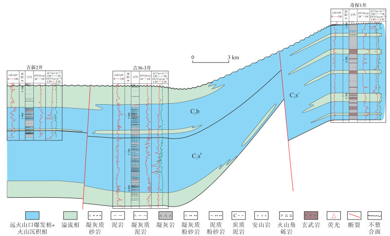下载原图 图 7 准东地区吉木萨尔凹陷吉新2—吉36-3—奇探1井石炭系连井相剖面 Fig. 7 Carboniferous well-tie facies section of wells Jixin-2-Ji36-3-Qitan-1 in Jimusar Sag, eastern Junggar Basin |