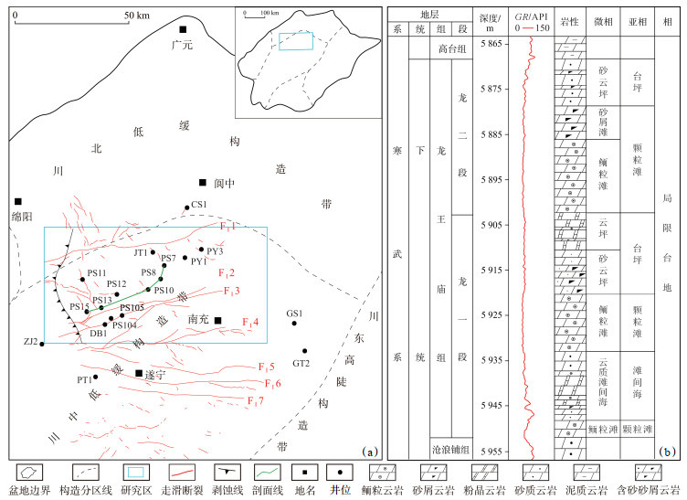 1 地质概况蓬莱气田位于乐山—龙女寺古隆起北部的斜坡带[6],构造上隶属于川中平缓构造区(图 1a)[13],其西侧为德阳—安岳裂陷槽,南侧紧邻安岳气田[14]。川中地区发育近东西向的走滑断裂,这些断裂于震旦纪初步形成,并在加里东期、海西期、印支期及燕山期等多期构造运动中持续活动[15-17]。研究区寒武系自下而上依次划分为筇竹寺组、沧浪铺组、龙王庙组、高台组和洗象池组[16],龙王庙组与上、下地层均呈整合接触。龙王庙组沉积期整体呈现西高东低的构造格局,经历了2期三级海平面升降旋回[18],以碳酸盐岩局限台地沉积为主体[19],可进一步划分为2类亚相:一类是水体能量较高的颗粒滩,主要岩性为鲕粒云岩和砂屑云岩;另一类为水体能量较低的滩间海与台坪,主要发育砂质云岩和泥粉晶云岩[8, 20]。受桐湾运动影响,乐山—龙女寺古隆起在川中地区继承性发育[21-22],至龙王庙组沉积初期发生大规模海侵[23-25],古隆起主要表现为水下古隆起,其相对高部位广泛发育颗粒滩。根据2期海平面升降旋回中所显示的岩石类型及自然伽马(GR)曲线特征,可将龙王庙组划分为龙一段和龙二段,龙一段以厚层颗粒云岩与厚层泥粉晶云岩、砂质云岩交替沉积为特征;龙二段则以巨厚层颗粒云岩为主,夹中—厚层粉晶云岩和砂质云岩(图 1b)。