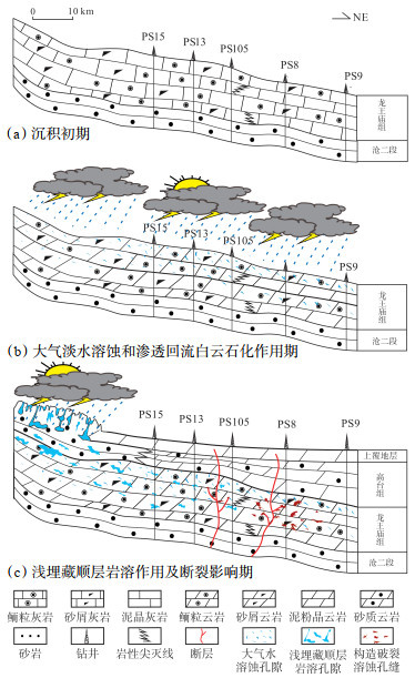 龙王庙组在纵向上发育2~3期滩体,主要分布于龙一段中上部、龙二段中下部和龙二段中上部,其中,西部PS15—PS13井区为3期滩体叠置,向东逐渐变为2期(图 10a),优质储层主要发育于滩体中,反映出岩性、岩相对储层发育的控制作用。当每期滩体沉积后,因滩体建造或海平面相对下降暴露于海面,遭受大气淡水组构选择性溶蚀,对未稳定的文石、高镁方解石等易溶矿物进行选择性溶蚀,形成大量粒内溶孔、粒间溶孔以及少量溶洞和铸模孔(图 10b)。同时,龙王庙组沉积期为干旱炎热的古气候环境,海水持续蒸发,盐度不断升高,发生大规模准同生渗透回流白云石化,形成大量白云岩(图 10b),并在埋藏环境中有效保护了先期孔隙。进入浅埋藏环境后,研究区西部被抬升,形成西高东低的古地貌,西部遭受大气淡水溶蚀,部分淡水在自身重力作用下沿层间缝或天然裂缝向研究区流动,持续溶蚀碳酸盐岩组分,形成大量溶洞型优质储层(图 10c)。进入中—深埋藏环境后,下伏筇竹寺组烃源岩开始大规模生排烃,生成大量有机酸,加之加里东期和海西期多期构造运动产生裂缝,有机酸沿断裂或裂缝进入龙王庙组,溶蚀易溶组分,进一步改善先存孔洞或形成新的溶蚀孔洞(图 10c)。