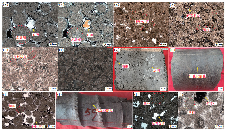 通过对研究区龙王庙组鲕粒云岩和砂屑云岩的岩心及薄片观察,识别出储集空间可分为宏观和微观2类。其中,宏观储集空间以顺层状溶洞和针状溶孔为主,构造(溶蚀)缝及孤立溶蚀孔洞次之。溶洞洞径一般为2~15 mm,主体为2~10 mm,多呈扁平椭圆状(图 2g);针状溶孔孔径为0.1~2.0 mm,以1.0 mm左右为主(图 2h—2j),溶洞与针状溶孔多被沥青、白云石、石英等半充填至全充填,少量未充填。裂缝以构造溶蚀缝为主,构造缝较少,构造溶蚀缝与构造缝大致沿同一方向延伸,前者边界因溶蚀呈不规则港湾状(图 2j),后者溶蚀较弱,边界较平直(图 2h),按视倾角大小可将其分为近水平、低角度、高角度和近垂直裂缝,以近水平和低角度裂缝为主,裂缝宽度为0.1~1.0 mm,多数为0.1~ 0.5 mm,多被沥青、白云石或黄铁矿全充填,少量未充填或半充填。