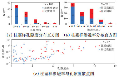 2.3 物性特征基于研究区龙王庙组107个柱塞样品的孔隙度测试和97个样品的渗透率测试结果,储层孔隙度为2.00%~16.08%,主要为2.00%~6.00%,平均约4.54%;优质储层孔隙度主要为4.00%~8.00%,平均约6.00%(图 3a);渗透率为0.000 1~11.700 0 mD,主要为0.001 0~1.000 0 mD,平均约0.490 0 mD(图 3b);优质储层渗透率主要为0.010 0~1.000 0 mD,平均约0.750 0 mD(图 3b)。孔隙度与渗透率表现出良好的正相关关系(图 3c)。综合柱塞样品物性分析结果,并参照现行油气储层评价标准(SY/T 6285—2011)[26],研究区龙王庙组储层总体属于低孔-低渗储层。