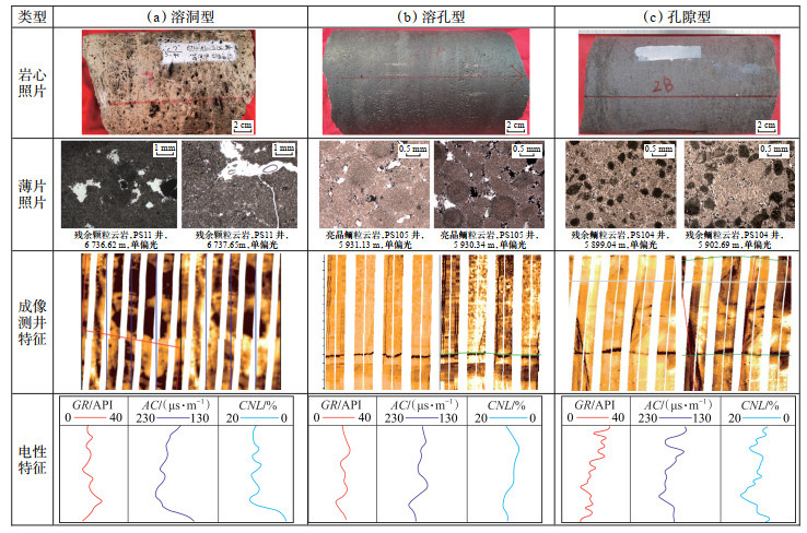 根据研究区龙王庙组宏观岩心、微观薄片、成像测井及常规测井等特征,将其储层类型划分为溶洞型、溶孔型和孔隙型3类。溶洞型储层以宏观溶洞为主要储集空间,溶洞占储集空间比值大于50%,平均测井解释孔隙度约4.2%;溶孔型储层以宏观针状溶孔为主,针状溶孔占储集空间比值大于50%,含少量溶洞,平均测井解释孔隙度约3.6%;孔隙型储层则以微观溶蚀孔隙为主,溶洞少见,占储集空间比值小于50%,平均测井解释孔隙度约3.0%。优质储层包括溶洞型和溶孔型储层,其特征见表 1所列。