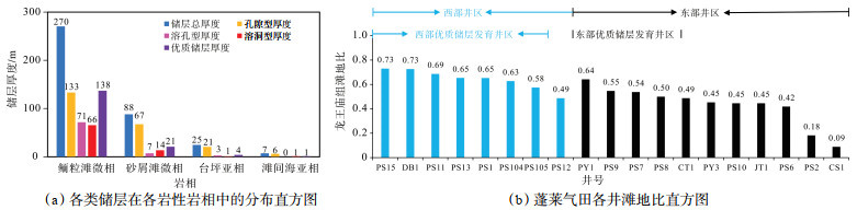 3.1 沉积相沉积相不仅控制优质储层的原生孔隙发育,也有利于后期次生孔隙的形成。前人研究表明,蓬莱气田龙王庙组与川中安岳气田龙王庙组沉积环境相似,均以局限台地相为主[27]。基于5口取心井数据统计分析,研究区龙王庙组储层在鲕粒滩微相、砂屑滩微相、台坪亚相和滩间海亚相中均有发育,且以前2种微相为主,鲕粒滩和砂屑滩微相储层总厚度分别为270 m和88 m,总厚度占比分别约69.23% 和22.56%,而台坪和滩间海亚相储层发育较差。优质储层主要发育于鲕粒滩微相中,总厚度达138 m,约占研究区优质储层总厚度的84.15%;砂屑滩微相、台坪亚相和滩间海亚相的优质储层厚度分别约21 m,4 m和1 m,占比分别约12.80%,2.44% 和0.61%(图 5a)。结合各井滩地比分析,研究区内存在2个滩地比高值区,分别为西部的PS15— PS11—PS105井区和东部的PS8—PY1井区,西部井区滩地比为58%~73%,平均约67%;东部井区滩地比为50%~64%,平均约56%(图 5b),而龙王庙组优质储层也主要发育于这2个高值区内,进一步证实了沉积相对优质储层发育的控制作用。