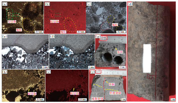 3.2.3 浅埋藏顺层岩溶作用浅埋藏顺层岩溶作用是优质储层中孔洞进一步溶蚀扩大的关键。通过岩心观察及镜下薄片鉴定,可识别出以下典型顺层溶蚀现象:①岩心中常见顺层分布的扁平状、拉长状溶孔和溶洞(参见图 2g);②岩心中存在“花边状”岩溶通道[40](图 6d);③角砾与陆源石英、基岩等混杂堆积(图 6e,6f);④岩石发生组构非选择性溶蚀,基岩及胶结物均被溶蚀(图 6e,6f)。这些证据表明研究区龙王庙组曾发生岩溶作用,由于上覆高台组岩性为混积碳酸盐岩与陆源碎屑岩,且岩溶带中未见明显渗流粉砂特征,推断该期岩溶作用发生于埋藏成岩环境。