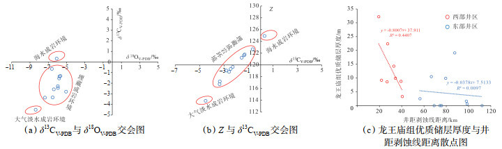 该作用是龙王庙组主要的白云石化机制[28],对优质储层孔隙保存起关键作用。蓬莱气田龙王庙组样品的碳、氧同位素分析显示,所有样品的δ18OV-PDB为-5.05‰~-8.38‰(表 3),均大于-10.00‰,且碳、氧同位素之间没有明显的相关性(图 7a)。前人研究指出,当δ18OV-PDB < -10.00‰时,岩石遭受强烈成岩蚀变,其碳、氧同位素信息已被强烈改造,不可用;当-5.00‰ < δ18OV-PDB < -10.00‰,岩石虽发生了一定程度的成岩蚀变,但仍基本保留原始海水信息,可供使用[29-30]。另一方面,δ13CV-PDB较δ18OV-PDB相对稳定[31],可观察两者是否具有相关性来判断岩石是否保留原始海水同位素信息,当两者没有相关性或相关性较弱,则岩石的同位素能够代表原始海水信息;反之则不能代表原始海水信息[32]。综上,研究区所有样品数据均有效,均能正常使用。