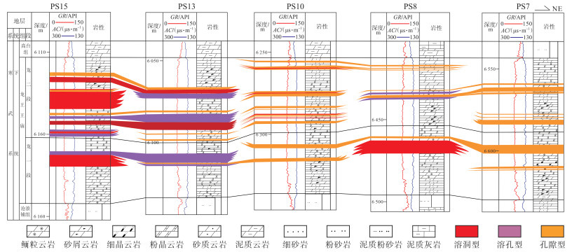 4 优质储层展布规律及发育模式 4.1 优质储层纵横向分布特征蓬莱气田龙王庙组优质储层以溶孔型和溶洞型为主,结合各类储层的岩性、测井曲线及成像测井特征,可识别各单井中龙王庙组优质储层的发育位置及类型。综合对比表明,优质储层在纵向上主要分布于龙一段近顶部、龙二段下部和上部,共3套,其中龙一段顶部、龙二段下部2套优质储层连续性较好,厚度一般为7~20 m;龙二段上部优质储层连续性较差,厚度约10 m(图 8)。横向上,优质储层主要分布于东西2个区域,分别为西部PS15井区和东部PS8—PY1井区,前者优质储层厚度普遍大于10 m,局部可达35 m以上;后者优质储层厚度主要为8~15 m。西部优质储层发育区纵向上发育2~3套,单套厚7~20 m;东部纵向上发育1~2套,单套厚3~10 m。整体上,优质储层向东发育程度逐渐减弱,厚度减小(图 8)。