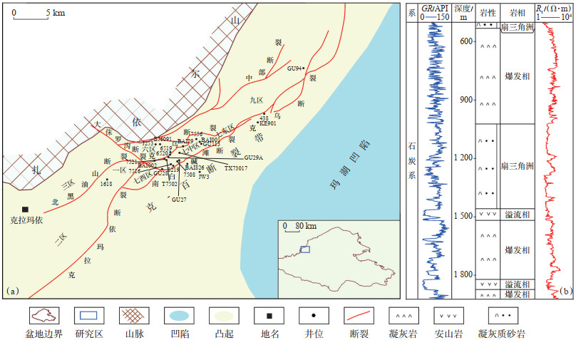 1 地质概况准噶尔盆地克-百大型冲断系统形成于晚古生代,西准噶尔洋在向哈萨克斯坦板块俯冲,使克-百地区成为碰撞隆起带。克-百断裂带位于准噶尔盆地西部隆起冲断带中段[6-8],平面上以断裂为界线划分为一、二、三、六、七、九区(图 1a),自下而上发育石炭系、三叠系、侏罗系和白垩系,由于逆冲推覆挤压二叠系被剥蚀殆尽。研究区六-七区石炭系为基底地层,表层风化壳已整体探明并开发,主要发育于石炭系顶部以下200~500 m。区域发育北东—南西向克乌断裂、南白碱滩断裂以及伴生的次级断裂,断裂系统发育,受构造挤压应力作用[9-11],沿断裂发育直劈缝、斜交缝、网状缝。根据取心井薄片鉴定和岩心观察统计分析,石炭系岩性包含火山喷发岩类、火山熔岩类、火山碎屑岩类和碎屑岩类四大类,主要为爆发相凝灰岩、溢流相安山岩及火山沉积相砂砾岩和砂岩(图 1b);储集空间类型为裂缝和溶蚀孔洞并存的双重介质型,油藏类型为受物性控制的裂缝-孔隙型油藏。