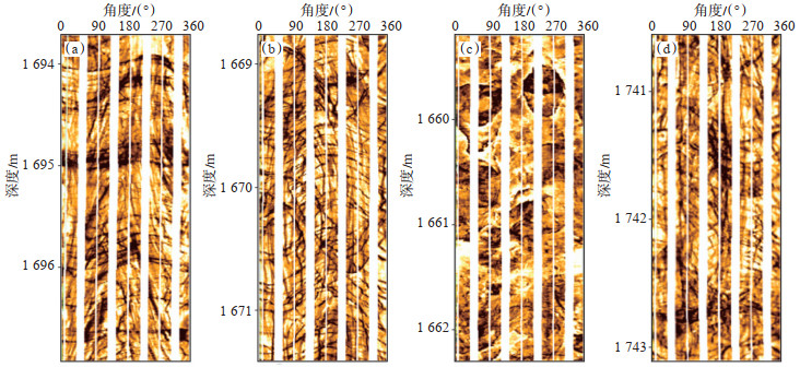下载原图 图 10 准噶尔盆地克-百断裂带六-七区石炭系典型井裂缝成像测井 (a)低角度斜交缝,TX73017井,1 694.0~1 697.0 m;(b)网状缝,TX73017井,1 678.5~1 681.5 m;(c)填充缝,TX73017井,1 659.5~ 1 662.0 m;(d)直劈缝,TX73017井,1 740.5~1 743.0 m。 Fig. 10 Typical wells fracture imaging logging of Carboniferous in the 6th and 7th blocks of Ke-Bai fault zone in Junggar Basin |