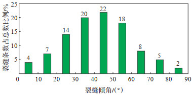 基质孔隙主要为晶间溶孔、晶内溶孔、基质溶孔、粒间溶孔、粒内溶孔(图 9e—9i)。裂缝类型主要为低角度斜交缝、网状缝、充填缝、直劈缝等构造缝(图 10)。斜交缝宽度为0.11~6.52 mm,多被充填,网状缝宽度为0.12~9.31 mm,裂缝倾角主要为30°~70°(图 11),这种高角度构造缝改善了火山岩储层渗流能力,呈网络状切割各种次生孔隙有利于油气富集,往往为高产区域[20-21]。