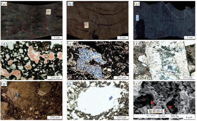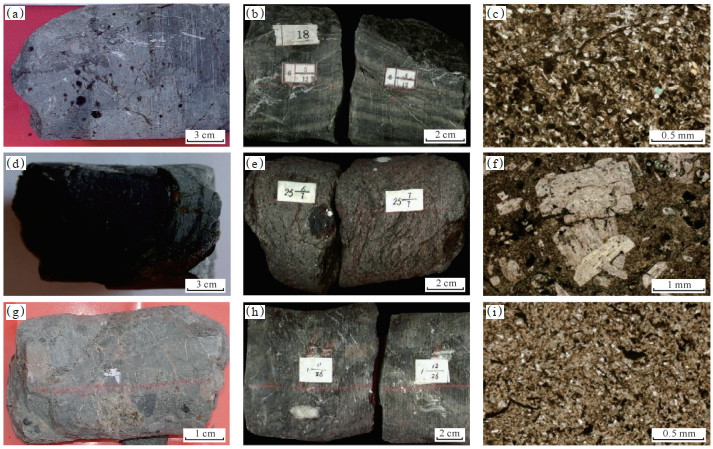 下载原图 图 2 准噶尔盆地克-百断裂带六-七区石炭系火山岩岩心和微观显微照片 (a)油迹级凝灰岩,BAI001井,1 249.66 m;(b)凝灰岩,BAI001井,1 231.42 m;(c)凝灰岩,沉凝灰结构,BAI001井,1 182.12 m,单偏光;(d)油斑级安山岩,BAI29井,1 613.89 m;(e)安山岩,GU113井,2 350.22 m;(f)辉石安山岩,斑状结构,GU113井,2 349.73 m,单偏光;(g)荧光级砂砾岩,BAI001井,1 482.15 m;(h)凝灰质砂岩,7556井,1 246.39 m;(i)凝灰质泥岩,泥质结构,7556井,1 249.3 m,单偏光。 Fig. 2 Core and microscopic photos of Carboniferous volcanic rocks of the 6th and 7th blocks in Ke-Bai fault zone, Junggar Basin |