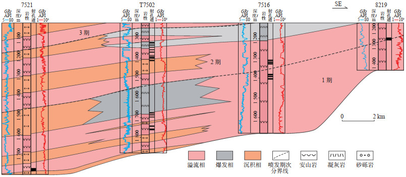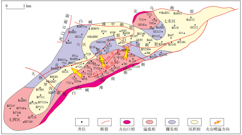基于156口井的钻井资料进行岩相刻画,结果(图 3)显示:七区的优势相带为溢流相[13-14],临近南白碱断裂发育火山口相,向北、向东为火山斜坡区,火山斜坡区以溢流相的安山岩和爆发相的凝灰岩为主;在七东区东部、七西区及六区构造低部位为火山沉积相发育区。