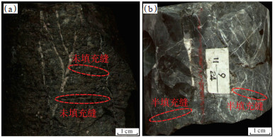 下载原图 图 5 准噶尔盆地克-百断裂带六-七区石炭系南北火山口岩心照片 (a)深灰色安山玢岩,高角度直劈缝,未全充填,低角度裂缝未充填—半充填,GU28井,1 294.80 m;(b)灰色安山岩,高角度网状缝被片沸石、方解石充填,而低角度裂缝未充填,7556井,1 314.11 m。 Fig. 5 Core photos of Carboniferous south and north trending volcanic vent in the 6th and 7th blocks of Ke-Bai fault zone, Junggar Basin |