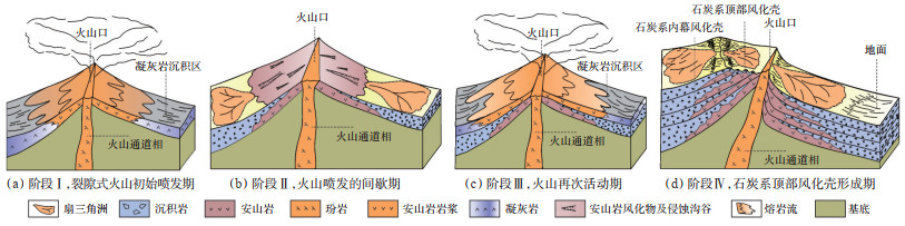 裂隙式火山初始喷发期(阶段Ⅰ),岩浆从火山口向低部位溢流,火山灰向远离火山口区域飘散(图 6a);火山喷发间歇期(阶段Ⅱ),火山喷发物受风化淋滤和搬运作用在构造高部位形成侵蚀沟谷,在低部位形成扇三角洲(图 6b);火山再次活动期(阶段Ⅲ),在强烈的火山爆发后,岩浆沿裂隙式火山口的两侧斜坡溢流披覆,覆盖在前期风化壳之上(图 6c);石炭系顶部风化壳形成期(阶段Ⅳ),火山活动停止,石炭系火山岩形成后,准噶尔盆地克-百断裂带发生大规模挤压逆冲推覆和构造抬升,顶部长时间接受风化侵蚀,在构造高部位斜坡区形成侵蚀沟谷,低部位地势低洼区发育扇三角洲沉积(图 6d);喷发期—喷发间歇期形成火山岩-沉积岩岩性组合。根据火山活动强弱、平面分布特征,各个期次旋回形成的岩性组合存在差异,纵向上岩性组合包括安山岩-凝灰岩-砂砾岩组合、安山岩-砂砾岩组合、凝灰岩-砂砾岩组合等,每种组合代表火山喷发和火山喷发后的风化、侵蚀作用的产物。