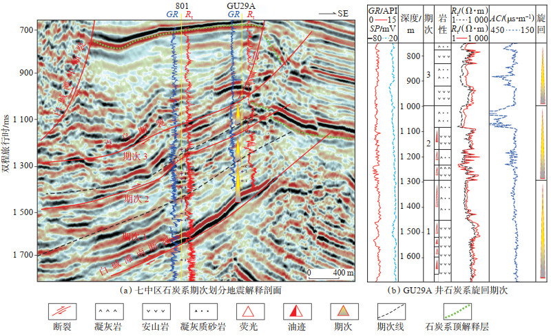 研究区地震资料面元为12.5 m×12.5 m,频宽为8~68 Hz,主频为30 Hz,地震剖面波阻界面、断裂特征均较清晰,石炭系内部成像较好,能进行内部期次的划分与对比。火山岩中的岩性差异,导致不同岩性物理性质差异,火山岩地层在长期逆掩构造应力挤压下沿密度较小容易释放应力的位置产生滑脱和形变,从而形成沿层的滑脱断层和裂缝(图 7a)。以七中区石炭系火山岩地层为例,其产状均为斜层,地震反射与横向地层展布特征一致,剖面上为地震同相轴平行反射特征,石炭系内幕地层与石炭系顶面以一定角度相交;垂向上发育3个旋回,与火山喷发期次有紧密关系,各期次岩性均表现为火山熔岩—火山碎屑岩—沉积岩,期次1石炭系底部发育安山岩+ 凝灰质砂岩沉积,期次2发育安山岩与凝灰岩互层+ 凝灰质砂岩沉积,期次3发育安山岩与凝灰质砂岩沉积,电阻率曲线表现为逐渐变低的趋势(图 7b)。各期次间界面形成强反射特征,通过地震剖面与井资料对比,可进行石炭系内幕不同期次界面刻画。