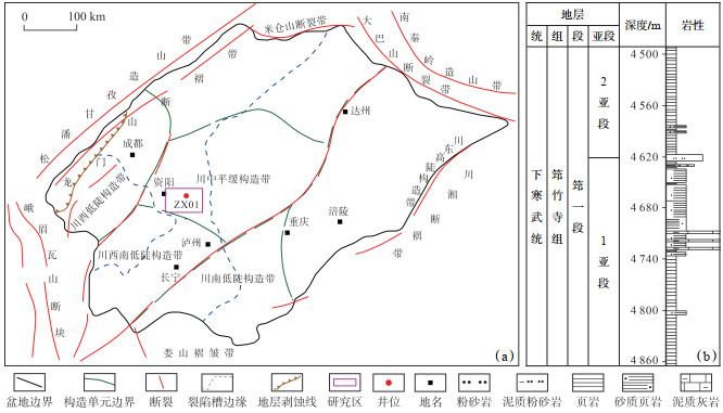 下载原图 图 1 四川盆地构造特征(a)及ZX01井寒武系筇竹寺组一段岩性地层综合柱状图(b)(据文献[12]修改) Fig. 1 Tectonic characteristics of Sichuan Basin (a) and comprehensive stratigraphic column of the first member of Cambrian Qiongzhusi Formation in well ZX01 (b) |