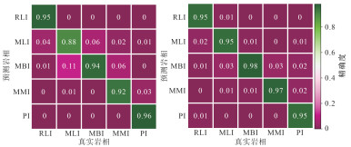 将设计的2种预测方法进行训练并预测,标签数据集中70% 的数据作为训练集,30% 为测试集。结果显示,预测方法1的精确度为93.0%,而预测方法2的精确度为96.0%(图 10);预测方法1对部分中有机质岩相(MLI、MBI和MMI)的预测精确度相对较低,而方法2改善了这种不足(图 11),证明引入LC曲线作为特征向量可以提升利用深度学习进行页岩岩相划分和预测的准确率。