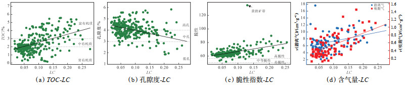 (3)纹层发育段通常具有高TOC、较强脆性和高含气量,LC曲线值可作为预测页岩气“甜点”的一种参数指标(LC > 0.16),为页岩气储层的“甜点”评价与靶体优选提供了新的思路。