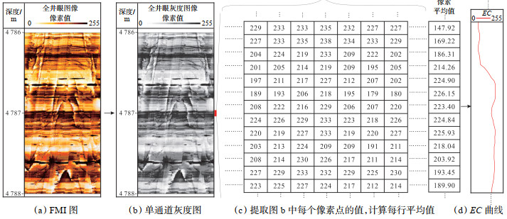 2.2 等效微电导率曲线(EC)提取在缺乏原始测井数据的情况下,直接从复原后的FMI图像中提取微电导率曲线是一项挑战。然而,图像中色彩的深浅变化能够间接反映电阻率或电导率的相对大小,可以通过分析二维图像中的像素点值来表征电阻率或电导率的变化,通常较低的像素值指示较高的电阻率(较低的电导率),较高的像素值则表示较低的电阻率(较高的电导率)。具体步骤(图 2):首先,将复原后的彩色图转换为单通道灰度图,提取单通道灰度图像中每个像素点的值,一般为0~255;其次,计算每一行像素点的平均值,该值代表该行的平均电导率大小;最终,在深度域上绘制出像素平均值的曲线,即可得到等效微电导率(EC)曲线。