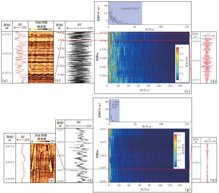 将深度视为时间域,对EC曲线进行频谱分析和演化频谱分析。设置滑动窗口为2.0 m,步长为0.02 m,选取部分纹层发育段(4 374~4 386 m)和块状段(4 471~4 479 m)的EC曲线进行MTM和SDFT处理。分析结果显示,纹层发育段的信号频率主要为0~65 m-1,而块状段的信号频率主要为0~20 m-1(图 3c,3g)。对EC曲线进行傅里叶带通滤波,设计频率为20~60 m-1,得到纹层信号增强曲线(LE)(图 3d)。傅里叶带通滤波的数学表达式为
