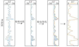 2.4 纹层发育曲线(LC)重构LE曲线能够直观展示纹层的发育情况,但难以用于后续的定量分析。因此,进一步对LE曲线进行处理:首先对其进行绝对值处理,然后提取包络线,并对包络线进行标准化(归一化)处理,最终得到能够用于定量分析纹层发育程度的曲线,命名为纹层发育曲线(LC)(图 4)。