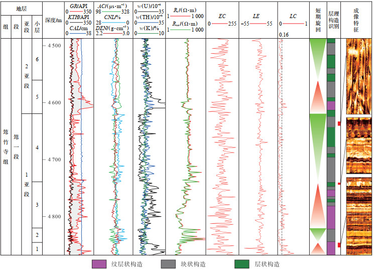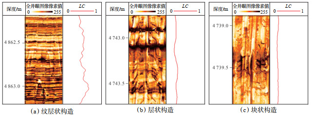(2)层状构造。在FMI图像上表现为厚条纹分布,条纹厚度大于40 mm,层理发育密度小于25条/m,LC值一般小于0.16(图 6)。层状构造的形成受机械沉积和化学沉积共同影响,指示较强的水动力和陆源输入,沉积速率较快,通常为浅水陆棚相沉积。