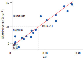 (1)纹层状构造。在FMI图像上表现为一定厚度范围内的明暗相间细条纹分布,条纹内部无明显色彩变化,单个条纹的厚度小于40 mm,层理发育密度大于25条/m(层理发育密度值是在FMI图像上不分构造段随机取19个长度为1 m的采样段,统计每段层理发育数量),LC值通常大于0.16(图 6)。海相页岩纹层的形成是由季节性悬浮和化学作用交替沉积形成的[7],表明沉积环境为静水动力,沉积过程缓慢,通常为深水陆棚相沉积。