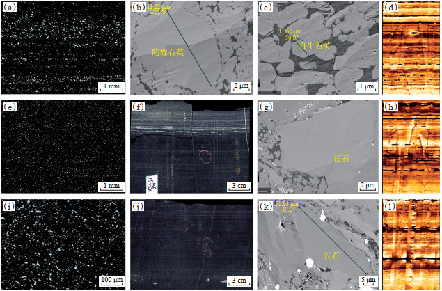 (3)5小层(4 587~4 620 m)发育石英质长石纹层,石英、长石的平均质量分数分别为37% 和38%。扫描电镜下未见自生石英,颗粒排列紧密,长石较多,颗粒具有定向性。石英粒径一般为20~30 μm,长石一般呈长轴,粒径为30~50 μm。FMI图像上纹层较细密且不明显,伴随发育有页理缝(图 8i—8l)。形成方式与长石质石英纹层类似,但陆源输入相对较多。
