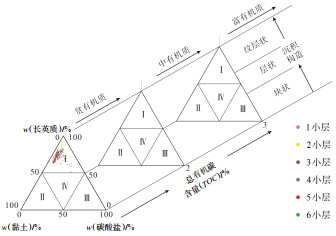 下载原图 图 9 四川盆地资中地区ZX01井寒武系筇竹寺组一段页岩岩相划分依据三重信息示意图 注:Ⅰ. 硅质页岩;Ⅱ. 黏土质页岩;Ⅲ. 钙质页岩;Ⅳ. 混合质页岩。 Fig. 9 Schematic diagram of triple-information-based shale lithofacies classification of the first member of Cambrian Qiongzhusi Formation in well ZX01 of Zizhong area, Sichuan Basin |