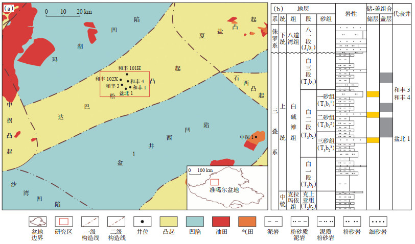 下载原图 图 1 准噶尔盆地达巴松凸起盆北1井区构造位置(a)及三叠系白碱滩组岩性地层综合柱状图(b) Fig. 1 Structural location(a)and comprehensive stratigraphic column of Triassic Baijiantan Formation(b) in Penbei 1 well area of Dabasong uplift in Junggar Basin |