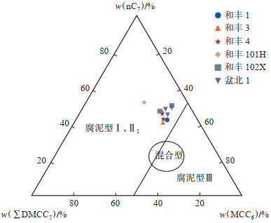 天然气C7轻烃化合物包括甲基环己烷(MCC6)、各类二甲基环戊烷(ΣDMCC5)和正庚烷(nC7),三者的相对组成可反映天然气母质类型,其中正庚烷主要来自藻类和细菌,二甲基环戊烷主要来自水生生物的类脂化合物,甲基环己烷主要来自高等植物木质素、纤维素和醇类等[41]。在准噶尔盆地达巴松凸起盆北1井区三叠系白碱滩组天然气的轻烃C7系列中,甲基环己烷质量分数为27.66%~43.48%,平均为39.57%;二甲基环戊烷质量分数为8.33%~20.57%,平均为14.21%,正庚烷质量分数为40.63%~51.77%,平均为46.22%,反映了腐泥型母质类型(图 10)。