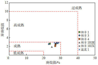 Thompson[42-43]提出天然气轻烃庚烷值和异庚烷值2个参数可以判断天然气的成熟度。按照不同的庚烷值和异庚烷值,可将天然气分为4类:①低成熟,异庚烷值≤ 1,庚烷值≤ 20.00%;②成熟,异庚烷值为1~3,庚烷值为20%~30%;③高成熟,异庚烷值为3~10,庚烷值为30%~40%;④过成熟,异庚烷值>10,庚烷值>40%。盆北1井区三叠系白碱滩组天然气庚烷值为23.16%~28.84%,平均为26.53%,异庚烷值为1.86~2.88,平均为2.56。基于轻烃庚烷值和异庚烷值2个参数的指标来分析,认为研究区白碱滩组天然气成熟度仅处于成熟阶段(图 11)。比较而言,轻烃估算得到的天然气成熟度较甲烷碳同位素计算得到的成熟度偏低。