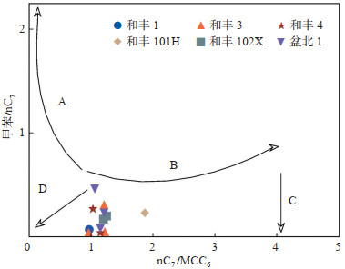下载原图 图 12 准噶尔盆地达巴松凸起盆北1井区三叠系白碱滩组天然气甲苯/nC与nC7 /MCC6蒸发分馏效应模式 Fig. 12 Evaporation fractionation effect pattern of nC7 / MCC6 and toluene/nC7 of natural gas of Triassic Baijiantan Formation in Penbei 1 well area of Dabasong uplift in Junggar Basin |