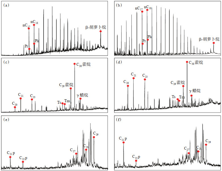 下载原图 图 13 准噶尔盆地盆1井西凹陷风城组烃源岩与达巴松凸起盆北1井区三叠系白碱滩组原油生物标志化合物对比 (a)黑色泥岩GC/MS总离子流,中探1井,7 242.64 m,P1f2;(b)原油GC/MS总离子流,和丰102X井,4 341~4 352 m,T3b21;(c)黑色泥岩萜烷质谱,中探1井,7 242.64 m,P1f2;(d)原油萜烷质谱,和丰102X井,4 341~4 352 m,T3b21;(e)黑色泥岩甾烷质谱,中探1井,7 242.64 m,P1f2;(f)原油甾烷质谱,和丰102X井,4 341~4 352 m,T3b21。 Fig. 13 Comparison of biomarker compounds between source rocks of Fengcheng Formation in wstern sag of well Pen 1 in Junggar Basin and crude oil of Triassic Baijiantan Formation in Penbei 1 well area of Dabasong uplif |