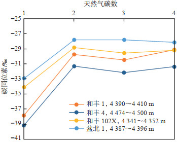 下载原图 图 14 准噶尔盆地达巴松凸起盆北1井区三叠系白碱滩组混源气碳同位素序列 Fig. 14 Carbon isotope series of mixed gas of Triassic Baijiantan Formation in Penbei 1 well area of Dabasong uplift in Junggar Basin |