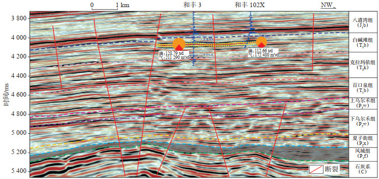 5.1.2 断裂系统与油气输导能力达巴松凸起具有良好的油气输导配置,研究区发育海西期、印支期和燕山期3期走滑断裂(图 16)。海西期断裂主要沟通深部石炭系潜在烃源岩;印支—燕山期断裂则有效连通了主力烃源灶,即盆1井西凹陷下二叠统风城组。这些断裂在纵向上的继承性活动与搭接,构成了高效的“油气运移桥梁”,使来自风城组和更深部石炭系的双源烃类得以向上运移,并在运移过程中发生不同程度的混合,最终在白碱滩组岩性、断层-岩性圈闭中聚集成藏。同时,白碱滩组圈闭形成于早—中侏罗世,风城组烃源岩主要排油期从三叠纪开始到早白垩世末,断裂的长期活动性确保了其与风城组主要排烃期的良好匹配,是形成有效圈闭的关键。