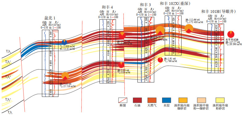 近期研究通过古地貌结合地震属性,精细刻画了盆北1井区三叠系白碱滩组沉积微相分布(图 17),白碱滩组T3b2发育典型的浊积扇体系,砂体垂向叠置,横向连片分布,T3b21顶部发育一套相对稳定的砂层,受半深湖泥岩包裹,属于典型的“泥包砂”型地层结构,自身储-盖组合条件优越。浊积内扇主水道(和丰3井、和丰102X井)以块状细砂岩为主,孔渗条件最佳,试油均获工业油气流;向中扇分支水道(和丰4井)和外扇末端扇(和丰101H井)过渡,粒度变细,储层物性变差,这种沉积相控储层非均质性是导致平面上油气富集不均的根本原因。