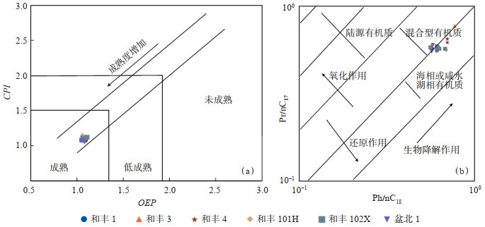 下载原图 图 2 准噶尔盆地达巴松凸起盆北1井区三叠系白碱滩组原油CPI与OEP(a)和Pr/nC17与Ph/nC18(b)交会图 Fig. 2 Crossplot of CPI vs. OEP (a) and Pr/nC17 vs. Ph/nC18 (b) of crude oil of Triassic Baijiantan Formation in Penbei 1 well area of Dabasong uplift in Junggar Basin |