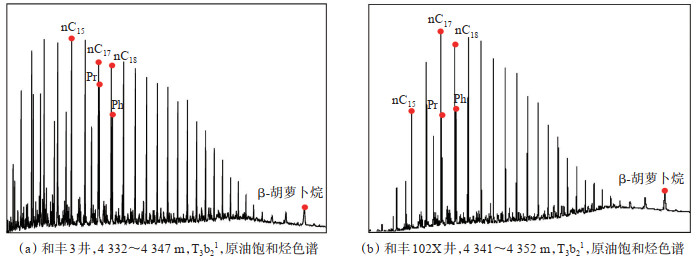 在异戊二烯烷烃中,研究区三叠系白碱滩组姥鲛烷(Pr)和植烷(Ph)丰度相对较高,Pr/nC17值为0.55~0.65,平均为0.59;Ph/nC18值为0.56~0.71,平均为0.63,Pr/Ph值为0.69~1.29,平均为1.11(图 2b)。通常情况下,Pr/Ph对于沉积环境十分敏感,可以指示母质来源原油的形成环境。Pr/Ph值<1.0标志着沉积环境为较强还原环境,Pr/Ph值>3.0标志着沉积环境为氧化环境[17]。由此可判断白碱滩组原油样品均来自偏还原环境下形成的烃源岩。