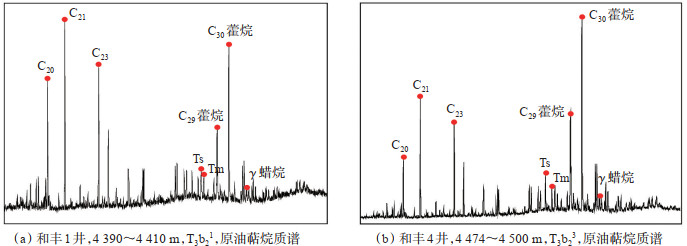 下载原图 图 3 准噶尔盆地达巴松凸起盆北1井区三叠系白碱滩组原油萜烷质谱图 Fig. 3 Mass spectrometry of terpenes and hopanes of crude oil of Triassic Baijiantan Formation in Penbei 1 well area of Dabasong uplift in Junggar Basin |