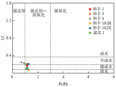 下载原图 图 5 准噶尔盆地达巴松凸起盆北1井区三叠系白碱滩组原油GI与Pr/Ph交会图 Fig. 5 Crossplot of GI and Pr/Ph of crude oil of Triassic Baijiantan Formation in Penbei 1 well area of Dabasong uplift in Junggar Basin |