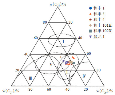 下载原图 图 7 准噶尔盆地达巴松凸起盆北1井区三叠系白碱滩组原油αααC27-C29规则甾烷组成特征 Ⅰ.硅藻和苔藓植物;Ⅱ.浮游生物/陆源植物;Ⅲ.浮游生物/藻类;Ⅳ.陆源植物;Ⅴ.浮游生物/细菌。 Fig. 7 Composition of αααC27-C29 regular steranes of crude oil of Triassic Baijiantan Formation in Penbei 1 well area of Dabasong uplift in Junggar Basin |