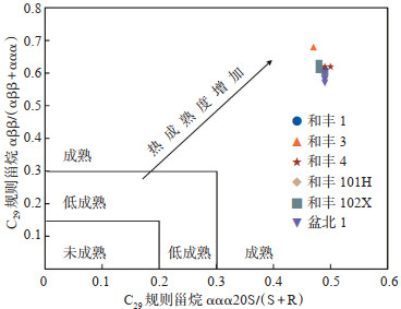 甾烷的立体异构体随成熟度的增加发生立体构型转化,因此其异构化参数可以用来指示有机质的热演化程度[33-34]。C29 20S和C29 20R规则甾烷在C-14和C-17位上的H原子异构化作用使ββ ββ+ αα)值与成熟度呈正相关关系,从大于0的低值逐渐增加到约0.5的高值(0.52~0.55为平衡值),盆北1井区白碱滩组原油C29规则甾烷αββ/(αββ+ααα)与C29规则甾烷ααα20S/(S+R)参数分别为0.57~ 0.68和0.47~0.50,在成熟阶段达到平衡(图 8)。