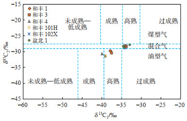 下载原图 图 9 准噶尔盆地达巴松凸起盆北1井区三叠系白碱滩组天然气δ13C2与δ13C1交会图 Fig. 9 Crossplot of δ13C2 and δ13C1 of natural gas of Triassic Baijiantan Formation in Penbei 1 well area of Dabasong uplift in Junggar Basin |