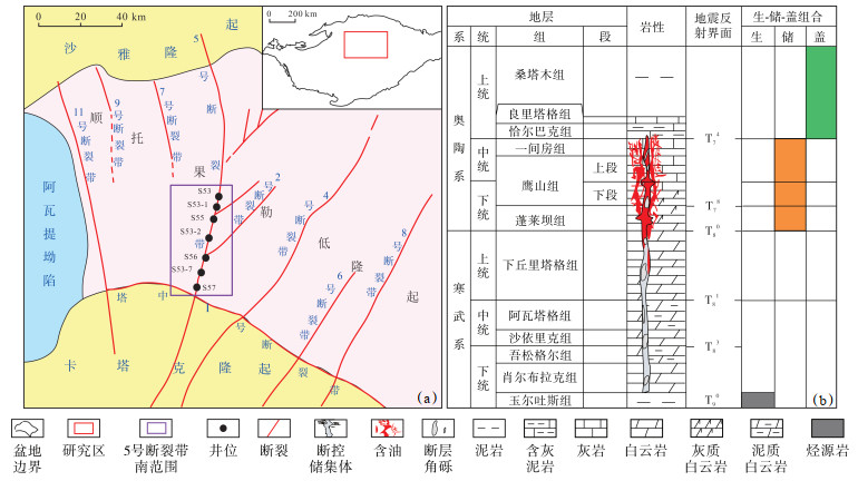 1 地质概况顺北地区位于塔里木盆地塔北古隆起与塔中古隆起之间的顺托果勒低隆起上,是一个夹持在2个隆起和2个凹陷之间的“鞍状”部位(图 1a)。该地区沉积了南华系—新生界碳酸盐岩和碎屑岩,目前钻井揭示寒武系—奥陶系发育完整,自下而上发育下寒武统玉尔吐斯组(Є1y)暗色泥岩、肖尔布拉克组(Є1x)白云岩、吾松格尔组(Є1w)膏盐岩,中寒武统沙依里克组(Є2s)灰岩和阿瓦塔格组(Є2a)膏盐岩,上寒武统下丘里塔格组(Є3ql)灰岩;下奥陶统蓬莱坝组(O1p)、中—下奥陶统鹰山组(O1-2y)和中奥陶统一间房组(O2yj)灰岩,上奥陶统恰尔巴克组灰岩(O3q)、良里塔格组(O3l)灰岩和桑塔木组(O3s)泥岩[20](图 1b)。