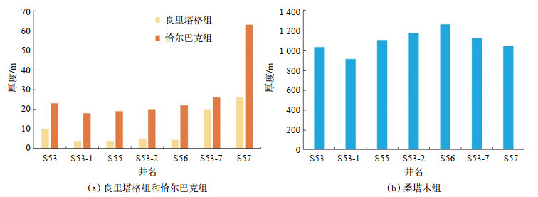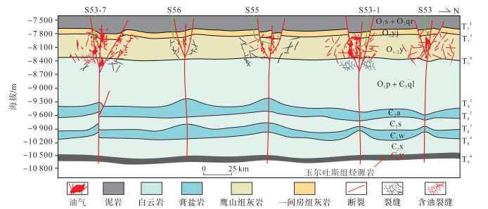 在奥陶系储集体上部发育泥岩盖层,主要为上奥陶统恰尔巴克组泥质灰岩、良里塔格组灰色泥晶灰岩和桑塔木组泥岩。统计结果表明,顺北5号断裂带南段恰尔巴克组平均厚度约27.3 m,良里塔格组平均厚度约10.5 m,桑塔木组平均厚度约1 095 m(图 3)。桑塔木组泥岩沉积厚度大,分布范围广,断裂极少发育,为奥陶系油气藏提供了良好的区域性盖层[27]。奥陶系碳酸盐岩本身的致密性也对油气的运移形成了良好的侧向封堵,良好的储盖配置为油气的成藏提供了较好的保存条件[28, 20]。