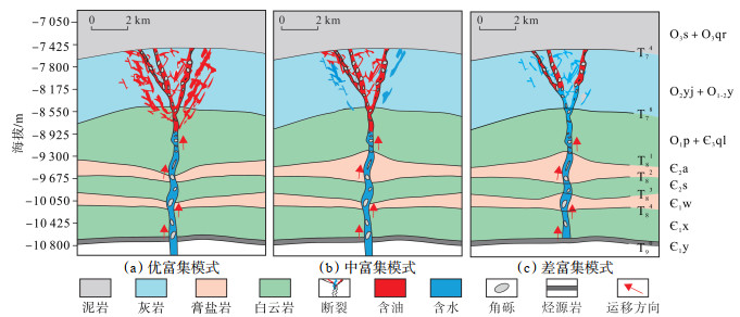 基于顺北地区走滑断裂带通源特征、输导运移特征、储集特征和油气分布规律,建立顺北地区断控缝洞型储集体通源性、输导性和储集性耦合控富的模式,具体可划分为“强通源-强输导-优储集-优富集”、“强通源-弱输导-优储集-中富集”和“弱通源- 弱输导-差储集-差富集”3种模式(图 11),下一步勘探以寻找“强通源-强输导-优储集”发育区为主要目标,以期在断控缝洞油气藏的勘探中取得更大的突破。
