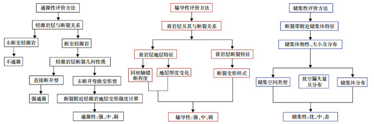 走滑断裂在超深层碳酸盐岩油气成藏过程中具有通源、输导、储集3种重要作用。为便于开展研究,将走滑断裂带能否有效沟通下部烃源岩[31-32],使油气能够进入断裂带称为“走滑断裂带的通源性”;将油气能够沿断裂带穿过膏盐岩层,垂向运移至上部缝洞储集体中聚集的输导能力称为“走滑断裂带的输导性”;将缝洞储集体能否大规模储存油气的有效性称为“走滑断裂带的储集性”;将主干走滑断裂的通源性、输导性和储集性统称为“主断裂三性”特征。结合断裂几何性质、与地层关系等特征,提出了超深层断控缝洞型油气藏“通源-输导-储集”三性半定量评价方法(图 4)。